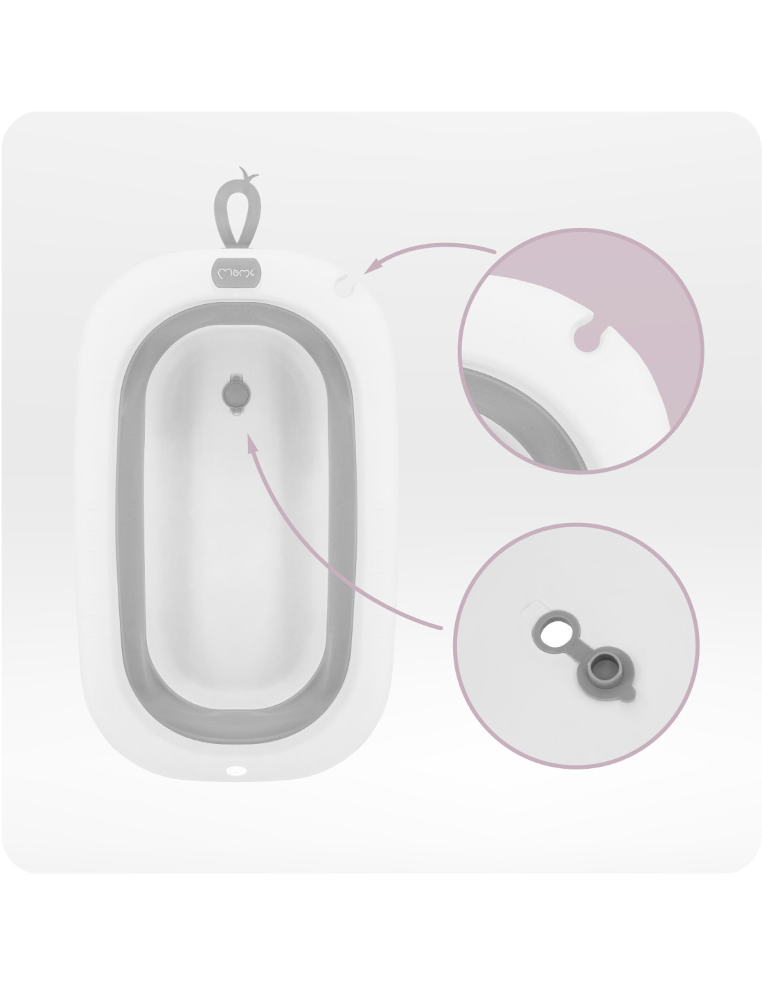 MoMi NATA ist eine faltbare, für Baby und Eltern bequeme Wanne mit praktischem Stöpsel, mit dem das Wasser schnell abgelassen werden kann. Die neutrale weiß-graue Farbe passt zu jedem Badezimmer.