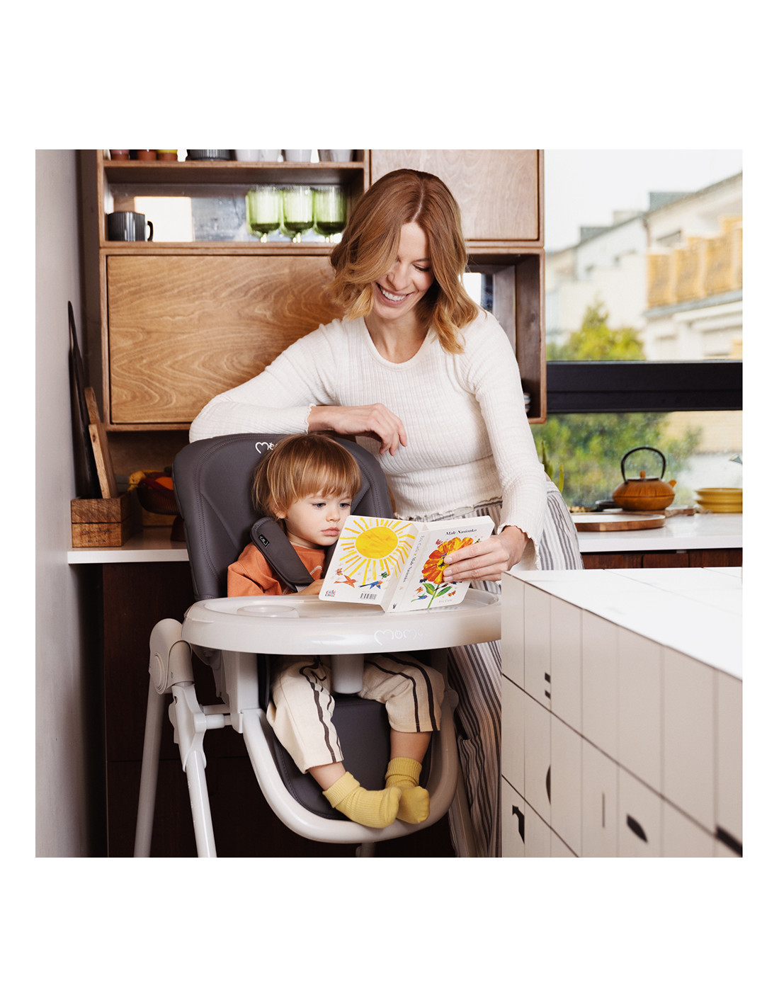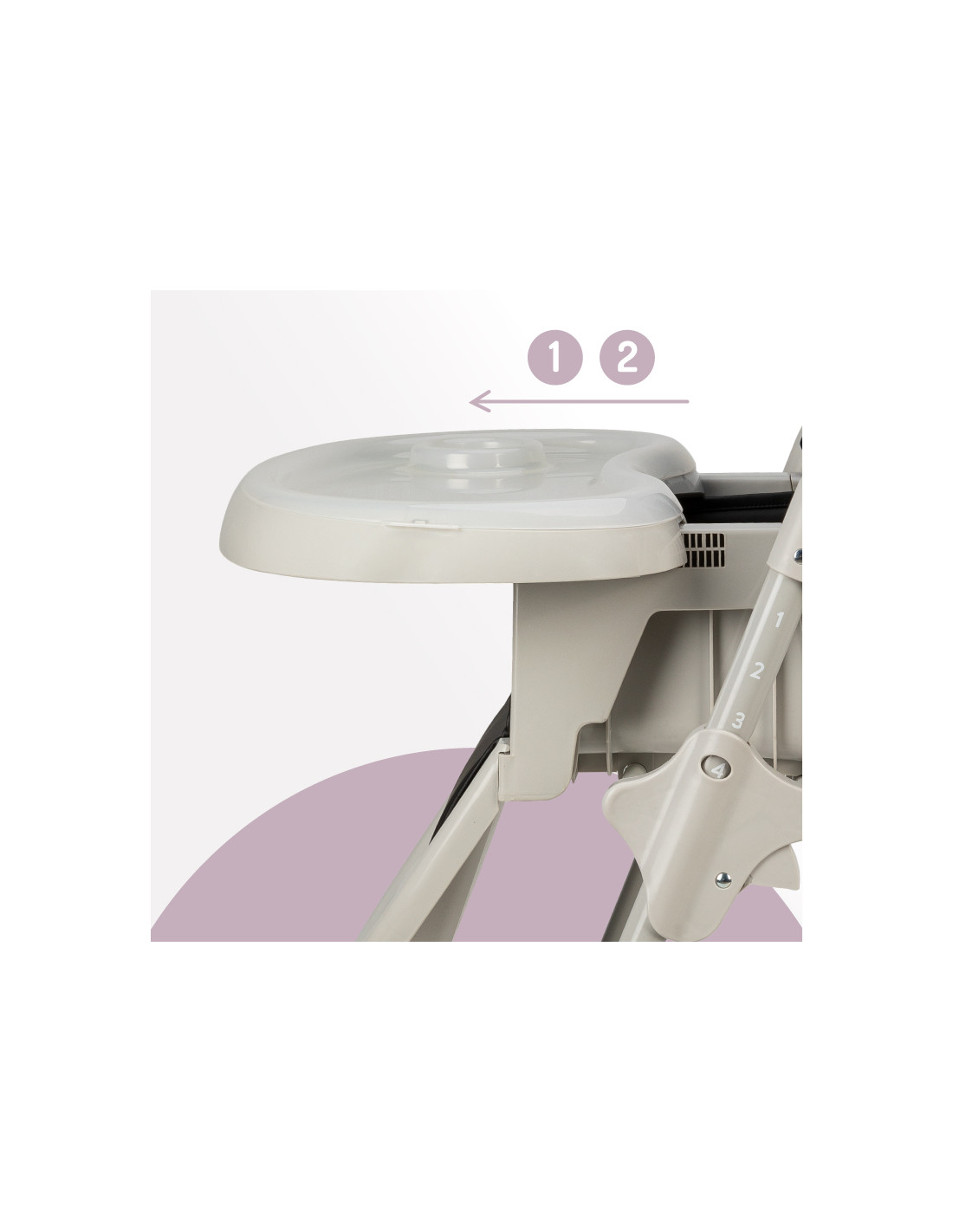 Das Tablett des MoMi GOJO Stuhls ist in 2 Stufen verstellbar. Ein zusätzlicher Vorteil ist die Möglichkeit, das äußere Tablett in der Spülmaschine zu reinigen. |