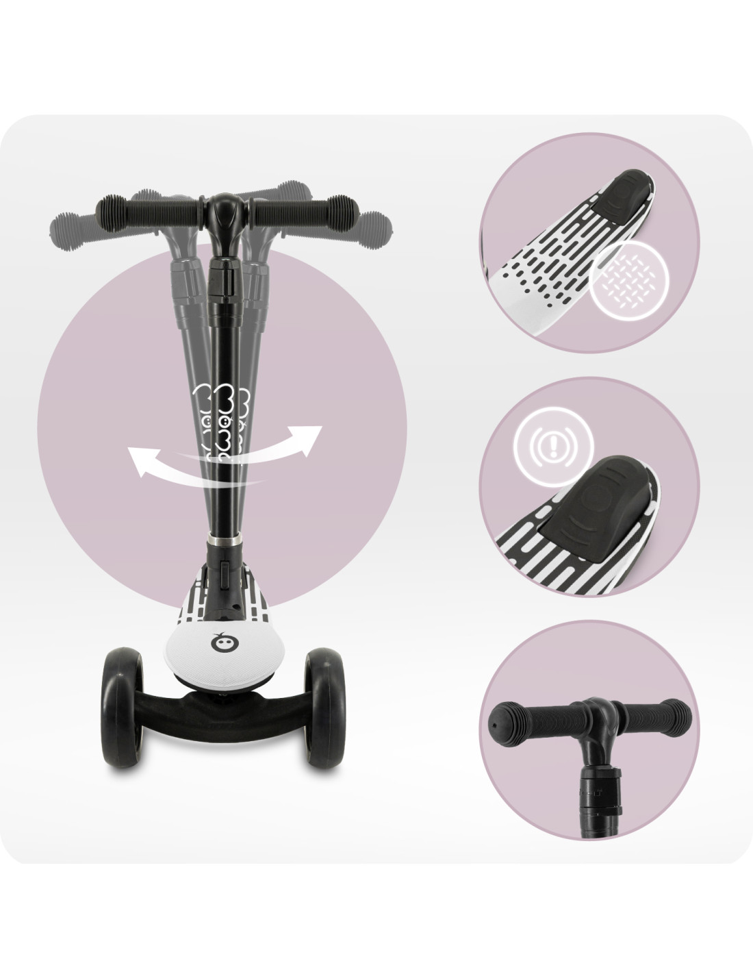 MoMi SAN to 3-kołowa hulajnoga balansowa idealna do nauki jazdy. Jest stabilna i bezpieczna dla dziecka. Posiada antypoślizgowy podest oraz uchwyty na kierownicy. Dla Malucha na pewno najważniejsze będą koła ze światłami LED, a dla Rodzica składana rama, która ułatwia transport i przechowywanie.