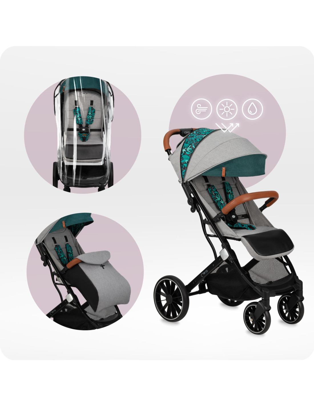 Spacerówka ESTELLE to jeden z bestsellerów MoMi. ESTELLE DAKAR JUNGLE to terenowa odsłona tego kompaktowego wózka. Dzięki dużym, nieprzebijalnym kołom doskonale radzi sobie w najbardziej wymagającym terenie. Posiada regulację oparcia, podnóżka oraz powiększaną budkę z okienkami. W zestawie znajduje się folia przeciwdeszczowa, moskitiera i śpiworek na nóżki .Do zestawu dołączono także ciepłe muffki MoMi SILDI w kolorze czarnym.