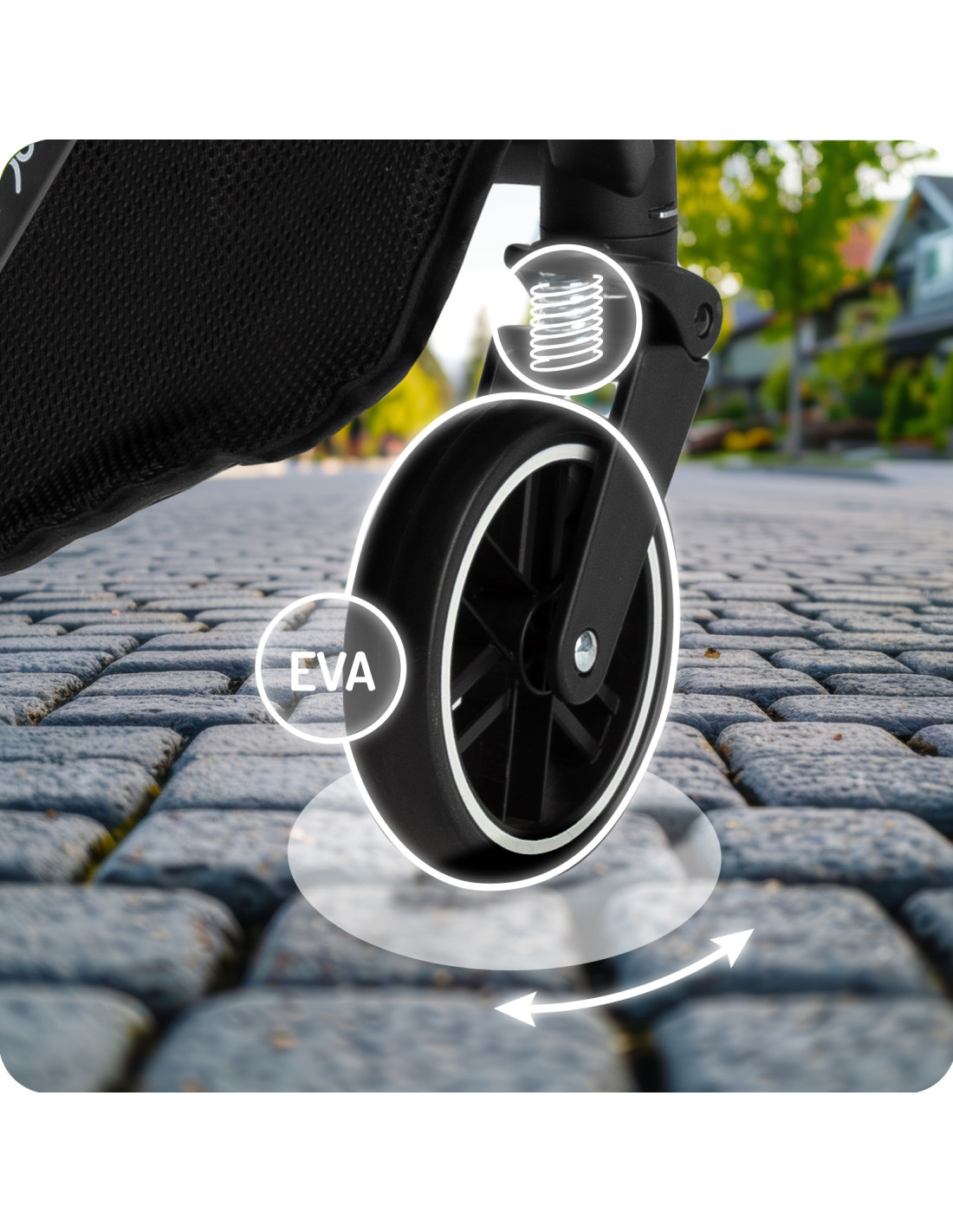 Zwrotne, nieprzebijalne koła Wózek MoMi ESTELLE DAKAR ma amortyzowane, duże koła, wykonane z odpornej na uszkodzenia pianki EVA. Rozmiar kół tylnych to 10”, przednich 7”. |